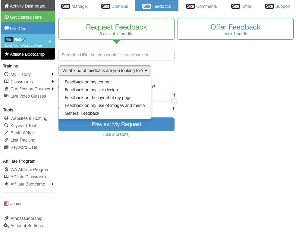 ***UPDATE*** I found that you can get website feedback right here on the Wealthy Affiliate platform. If you go to Site Rubix, then to Site Feedback, you can request several things. You can get: feedback on your content, feedback on your site design, feedback on the layout of your page, feedback on your use of images and media, or general feedback. I've attached a screen shot.
