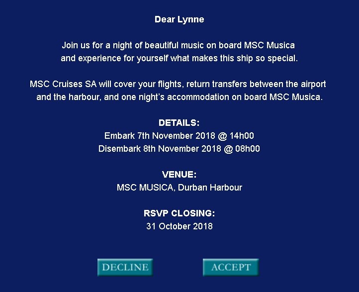 So guess what I am doing next week? I'm flying from Cape Town to Durban to spend a night on a cruise ship - flights, airport transfers, accommodation and food all free!