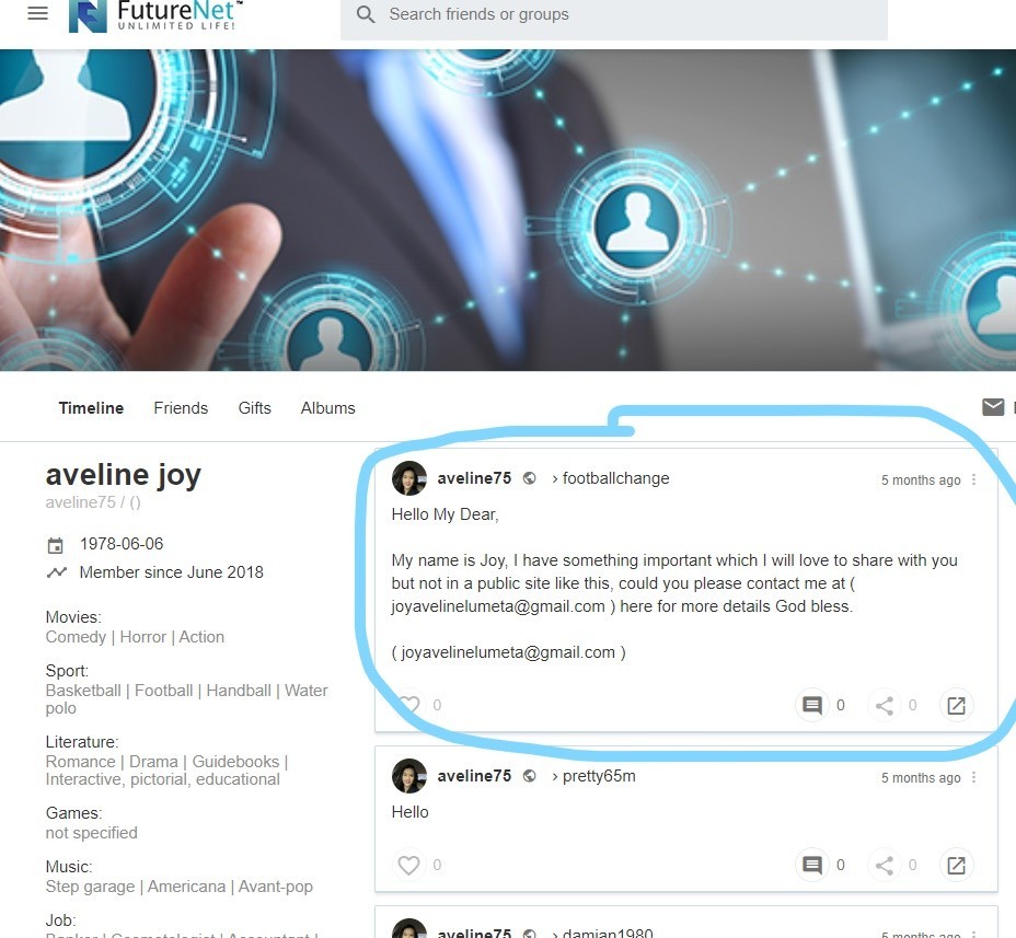I immediately alerted with this suspicious email and check her profile. This is the information available in her profile: