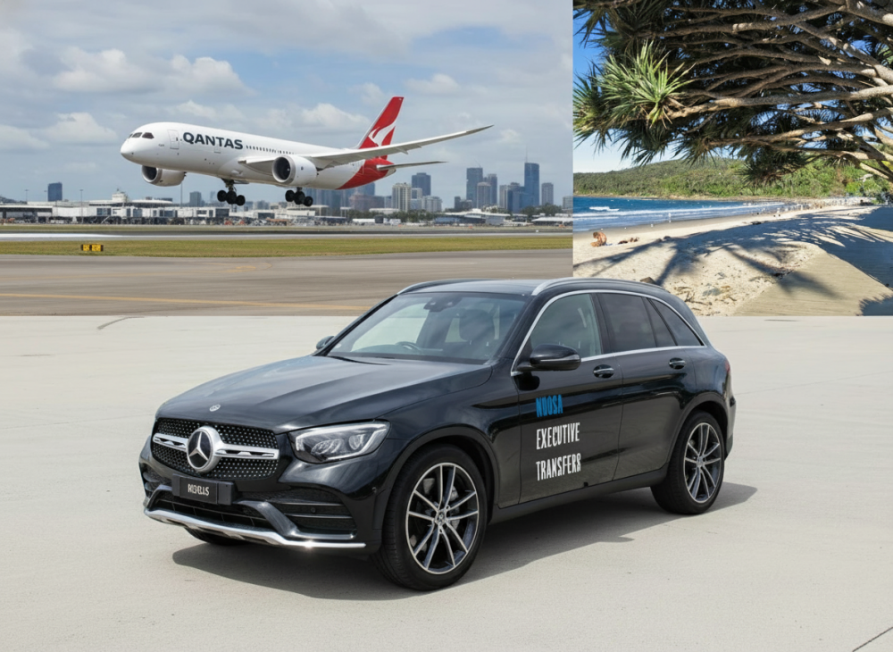 Sorry I thought I had inserted the prompt - here it is "An image of a plane landing at Brisbane Airpory on the left side and an image of Noosa Heads main beach on the right with a black mercedes GLC200 AMG2 in the middle with the Noosa Executive Transfers logo on the front door."