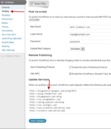 Settings > Writing > Update Services