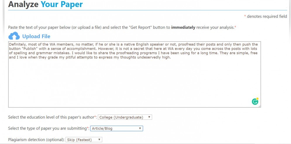 Definitely, most of the WA members, no matter, if he or she is a native English speaker or not, proofread their posts and only then push the button "Publish" with a sense of accomplishment. However, it is not a secret that here at WA every day you come across the posts with lots of spelling and grammar mistakes. I want to share the proofreading programs I have been using for a long time. They are simple, free and I love when they grade my pitiful attempts to express my thoughts undeservedly high. Both of the programs are available online in free and paid versions. The first is PaperRater at https://www.paperrater.com/. There is no need to register, just open the link and push the button "UseNowFree".