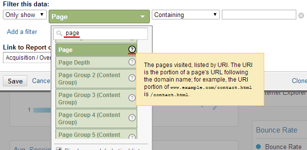 - In Search field type "PAGE" and find entry with just "page". You can click on question mar to make sure that this is correct entry. Info text should say: "The pages visited, listed by URI. The URI is the portion of a page's URL following the domain name; for example, the URI portion of