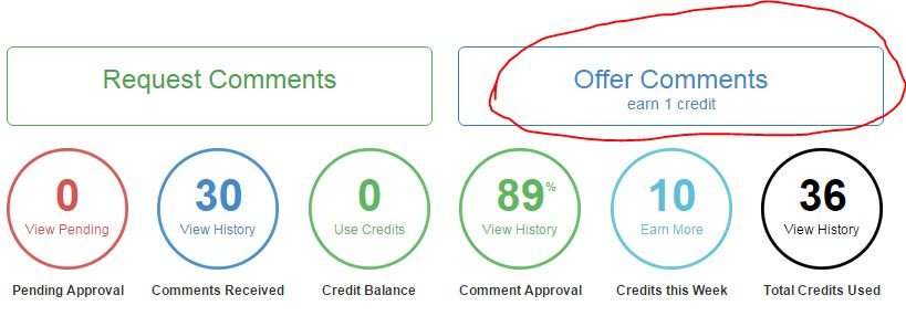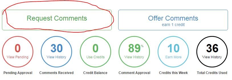 In order for you to request comments, you first have to comment on other people's sites! This means you have to be willing to help others before you ask them to do the same for you. WA is a community of real people, helping each other with different issues. Click the "Offer Comments--earn 1 credit" per a comment you made. You need at least two credits in order to request for comments on your site.