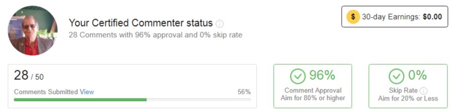 When I finally got back with it on April 27. With the 2 comments that I made this morning so far, I have made a total of 28 Comments. Only 22 to go until I hit the 50. I am sitting at 96% Approval rating and have had only 1 Disapproved. I also have a 0% Skip rate.