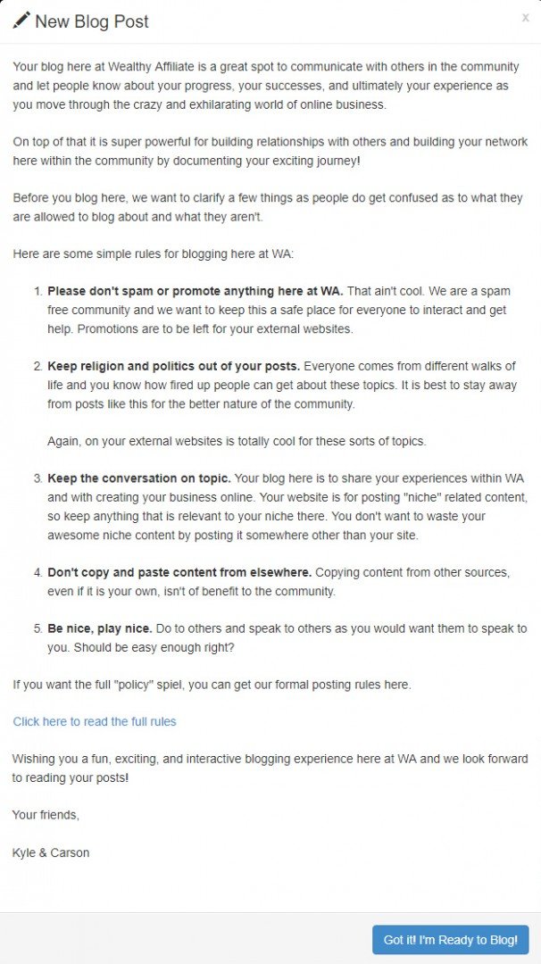 Today I mentioned the Wealthy Affiliate blogging rules to a new member. She was grateful that I made her aware of the rules but in a private message made a very pertinent comment: