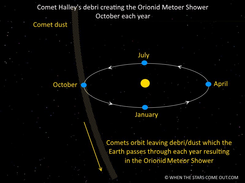 Comet Halleys debri creating the Orionid Meteor Shower this month