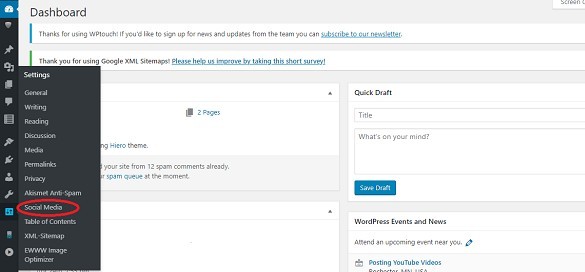 To customized your social media settings, go into the dashboard of your website and click on settings from the choices on the left side of your menu. You will then want to choose your social media plugin that you have added.