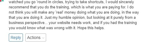 Seeing Premium Members ask/tell a new member in Live Chat to go back to the training after asking a question or telling them "this is what you are paying for" is not only upsetting to me but I feel gives our community the air that we do not want to help them.