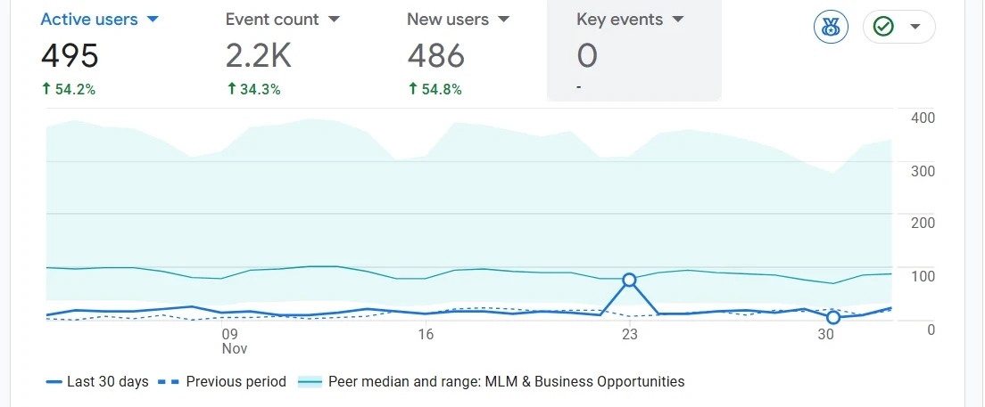 Starting with some numbers (ugh, my head hurts already, LOL 🤣), My Google Analytics snapshot for the past 30 days shows a 54% increase in active users and a 34% boost in overall event count. That’s 495 active users and 2.2K events.