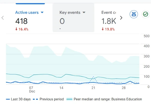 Over the last 30 days, the site recorded 418 active users. There was a small decline compared to the previous period, but nothing dramatic.