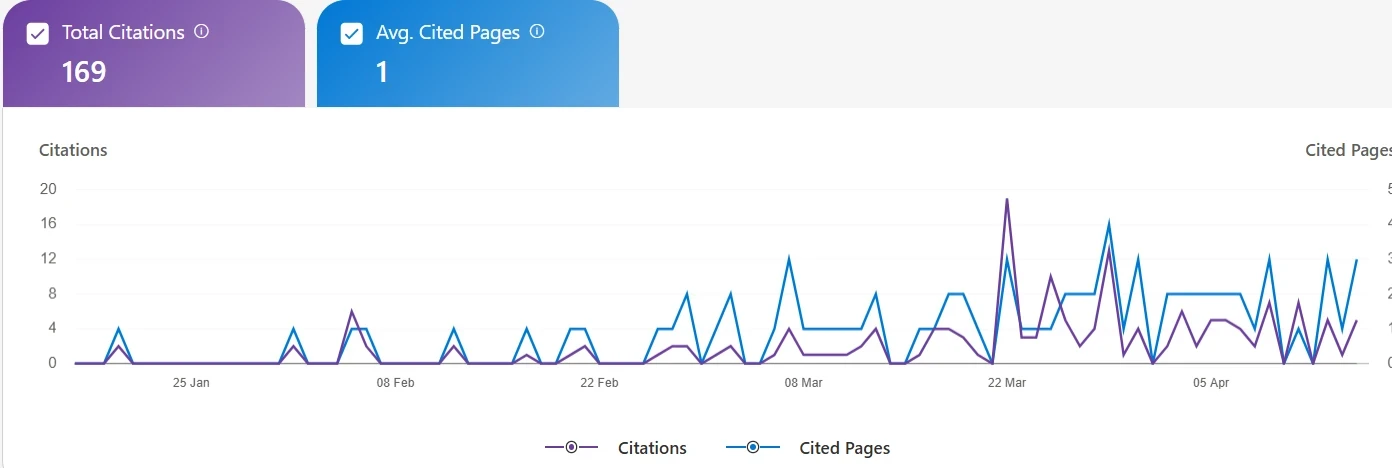And here is a screenshot from my Bing dashboard. Although I don't completely understand the difference between Total Citations and Avg Cited Pages, you can see something is happening. It also doesn't show me much about ground queries as much as it shows pages. There are a bunch of pages being referenced.