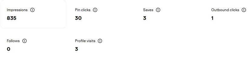 It has reached over 800 impressions, generated around 30 pin clicks, earned multiple saves, and even produced an outbound click, though I'm not sure how that happens from a pin with no information attached to it but ok.
