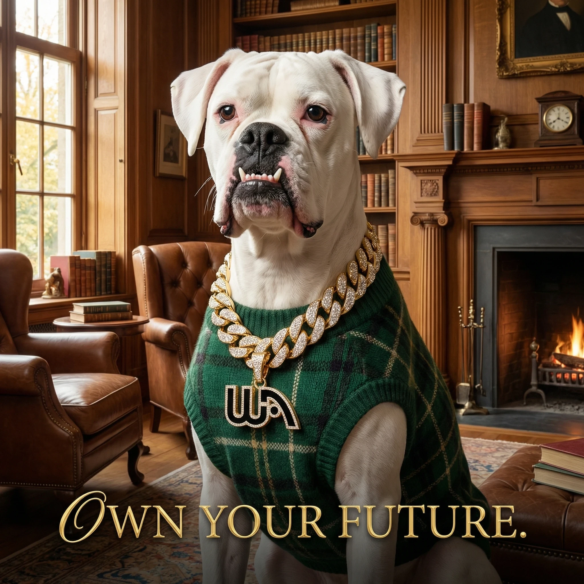 The setting is a classic library with a tailored sweater and gold chain to create an old-money, legacy-style aesthetic which is part of my overall brand. The image is meant to communicate wealth that is built slowly through knowledge and ownership, not chased through shortcuts.