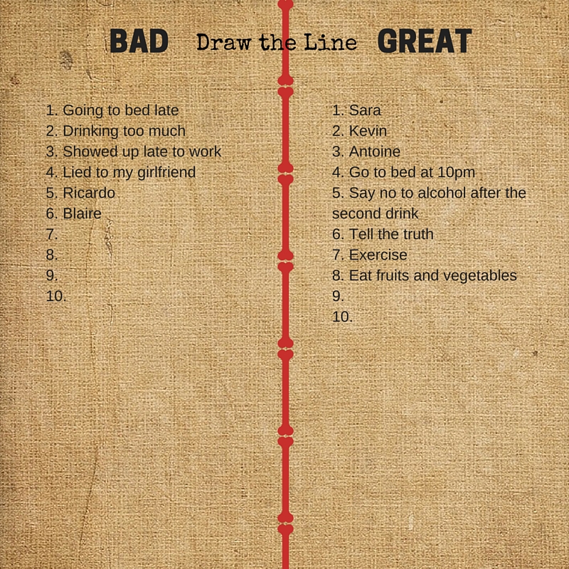 You might feel uncomfortable about writing someone's name on the “bad” side, but it's important for you to realize who's potentially holding you back with their negativity and who helps you grow. Spend more time with the great people in your life. When you wake up the next day, look at your list and intentionally get rid of the bad and add to the great.