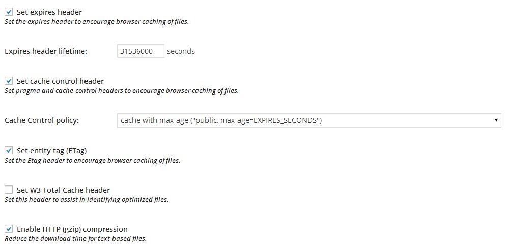 Back to the Wordpress menu on the left hand side, select 'Browser Cache' from the list. On this page tick to enable 'Set Expires Header' and 'Set Cache Control Header' for the 'CSS & JS', 'HTML & XML', and 'Media & Other Files'. Set the 'Expires Header Lifetime' on all 3 sections to 31536000 seconds and the 'Cache Control Policy' to cache with max-age ("public,max-age=EXPIRES_SECONDS"). Also make sure that 'Set Entity Tag' and 'Enable HTTP (gzip) Compression' are ticked for all 3.