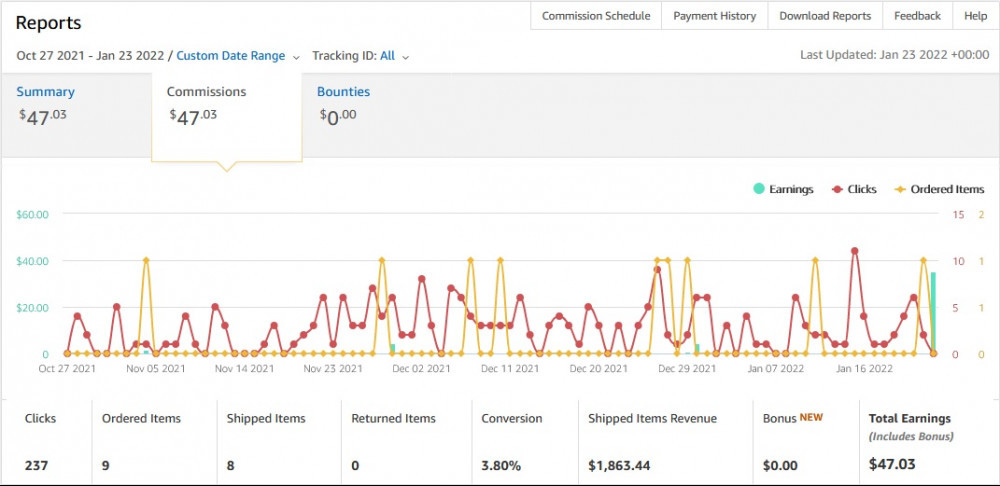 I just want to let you know during the first three months I earned $47 dollars commission in Amazon. Ordered items are 9 and shipped items are 8. I believe it is small success but a good start. Attached screenshot below.