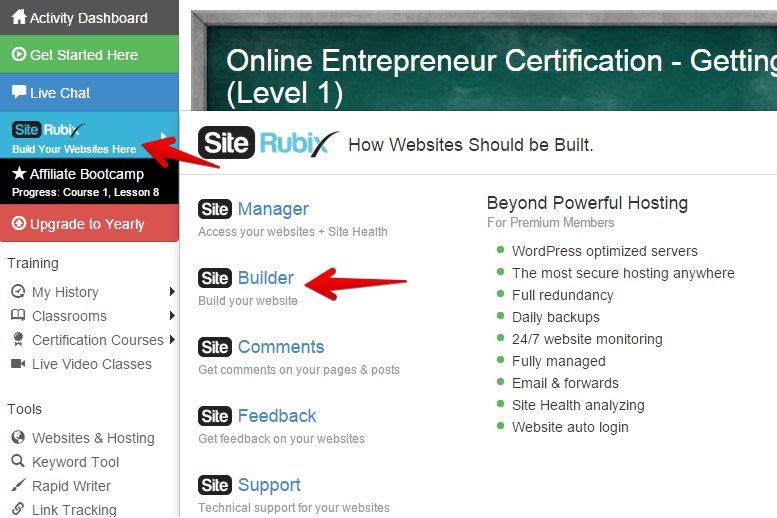 Ok, first, hover your mouse over the light blue smart button that says SiteRubix, then click on SiteBuilder.