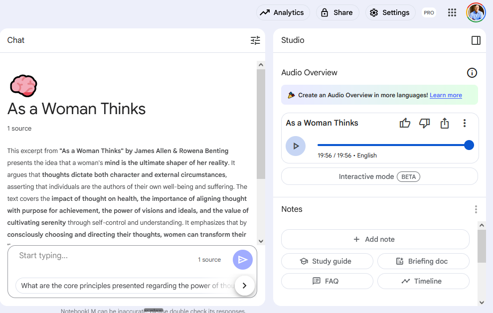 In the Studio, I clicked and asked for an audio overview which is like a podcast and you have 2 AI personalities, male and female discussing the work. Mine turned out to be 19 minutes 56 seconds.