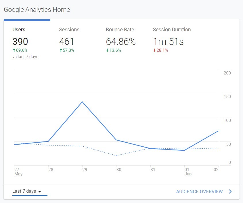 This is how my website traffic looks like after applying all the strategies here + #1 secret to effective content marketing. You see my bounce rate decreases alongside the increase of sessions within the last 7 days.
