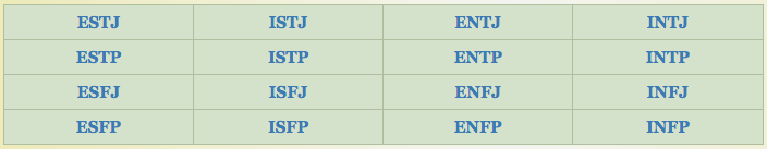 All the permutations of our preferences across the four dimensions yield 16 different combinations or personality types: