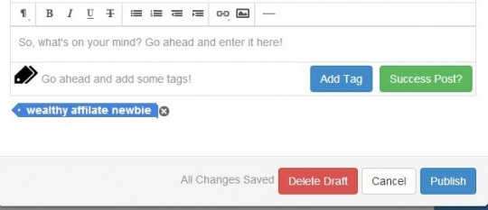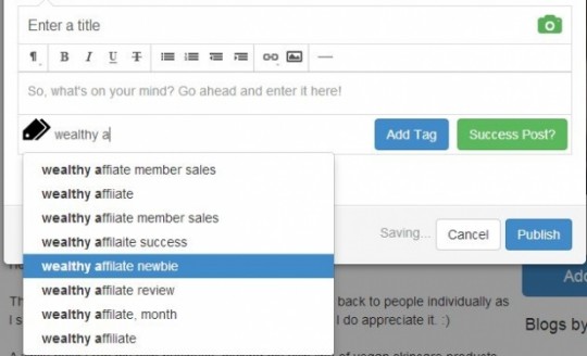 If your tag is a fairly common one, a list of similar tags will appear in a drop down menu. In this case I decided 'wealthy affiliate newbie' would be a better tag, so I moved my cursor to that. It highlighted in blue, then I clicked it.