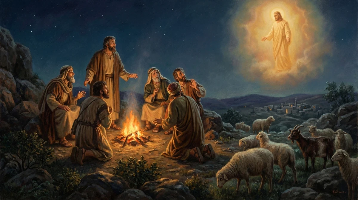 A realistic, painterly night scene inspired by Luke chapter 2. Shepherds are gathered on a hillside outside Bethlehem, sitting and standing near a small campfire under a dark, star-filled sky. Sheep are scattered calmly around the hillside. The shepherds wear simple first-century Judean clothing and have expressions of awe, fear, and wonder as they look upward. A radiant angel appears in the sky above them, glowing with soft heavenly light that illuminates the scene without overpowering it. The angel’s presence is peaceful yet overwhelming, casting warm highlights across the shepherds, the fire, and the sheep. The overall tone is reverent, dramatic, and realistic, with natural human proportions, historical accuracy, and a timeless, classical feel. Avoid cartoon or modern illustration styles.