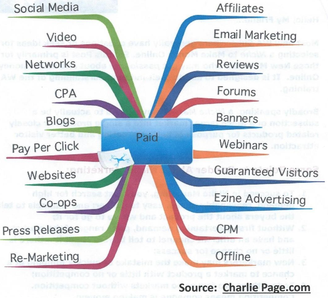 Now, generating traffic is simply attracting visitors to your Website. In searching for information on the subject for this Post and later Posting to my Website, I learned that smart marketers actually attract visitors to0 their Site by partly generating it themselves and partly by paying others (advertising) to do it for them.The following image represents the many channels used to attract Paid Traffic to your Website, in NO particular order of preference: