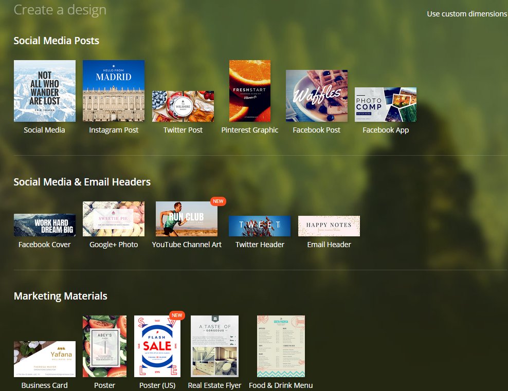 At the main dash board choose the design style you want. Click the plus sign to see all designs. For this I chose the first choice - Social Media.