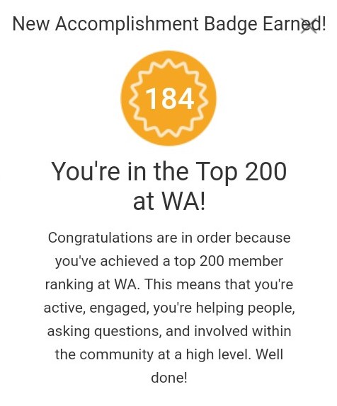 Basically, the Top 200 Badge means that I am an active member within the WA community. I even got a "Top Helper" title beside my name in the Top 200 list.