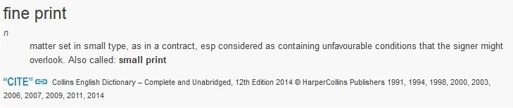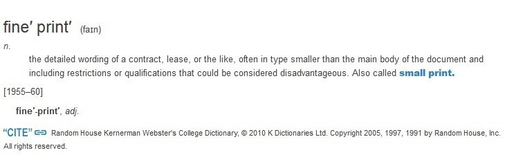 When looking up the definition of fine print, it doesn't really leave a pleasant taste in your mouth. It is widely understood that when someone makes a reference to the "fine print" there is a negative connotation implied.