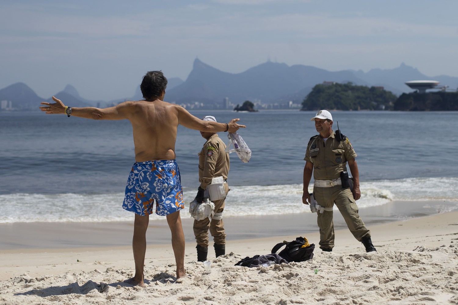 A uniformed guardsman asks a would be beachgoer to leave near the beach at Ipanema Brazil.