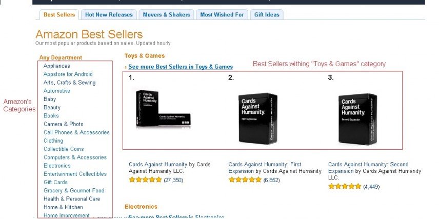 On the Amazon Best Sellers page, you'll see Amazon's categories, and to the right of the categories you'll see the top items displayed for each category.