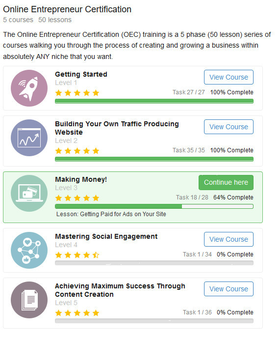 Online Entrepreneur Certification (50 Lessons) This 5 Phase, 50 Lesson course is going to be the fundamental core of your knowledge base and by the time you are finished this training you are going to be well-equipped to succeed within ANY niche, category or vertical online. This training is updated regularly to keep you ahead of your competition and industry trends.=