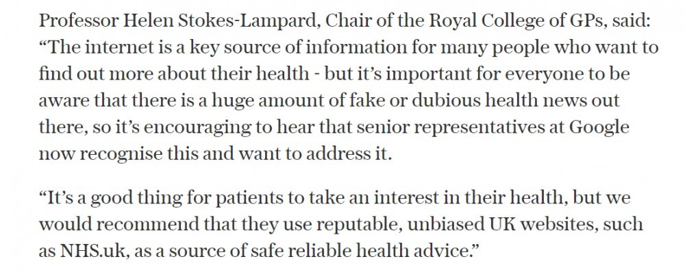 Weirdly enough the 'reputable' and 'unbiased' site they quote and the GPs they refer to are the precise health system that nearly killed me and chalked me up as a success saying, "Prove it". The people they want to ban from searches are the ones got me well.
