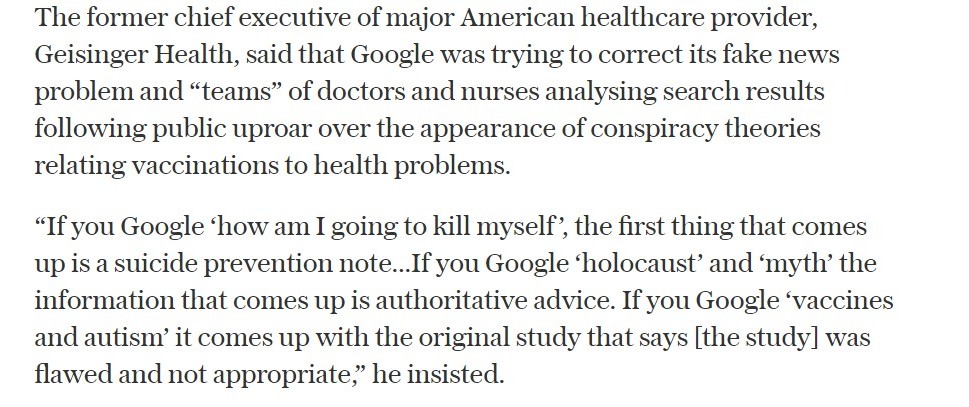 We've heard rumors of this before but they are really rolling out their plans now to shut down information that doesn't fit with their view. It started with health and they went so far as to put teams of doctors and nurses analysing search results, and it's now tackling everything going forward eg searches on the Holocaust go to 'authoritative' advice, and searches on vaccines and autism will go to 'the original study was flawed and not appropriate' even though that may not actually be true because a lot of whistle blowers came out of the industry on that. And we have a track record of industry engaging in an information war and the tobacco science and asbestos industry would have been very happy with Google's stance now: