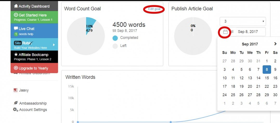Now you set the number of words/articles and choose the time frame, to do this simply click edit goal and the boxes will open up to let you put in number of words/articles. And to set the date just click on the calendar icon in the date, as in this pic
