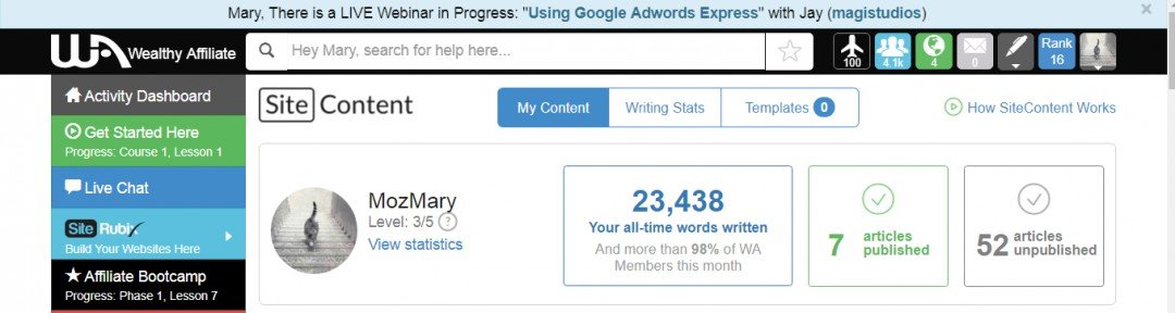 You can see my stats now say 7 articles published, whereas last week it was only at 4. Also my write status has improved to level 3 and my word count has gone up to 98% more than other WA members - but it is really the articles published that counts here for the website. You can also see that magistudios webinar is in progress so it is Friday night