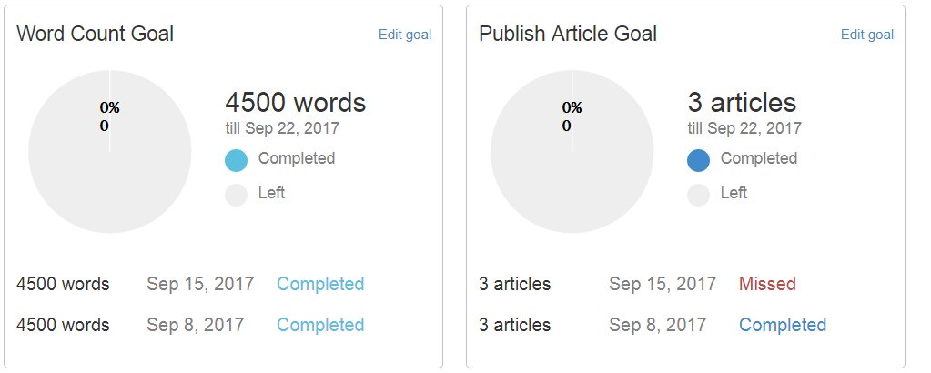These are the new goals that I've set for next Friday, September 22nd, and you can see it is constantly reminding me I was late with my third article OUCH so I'll be early this week!