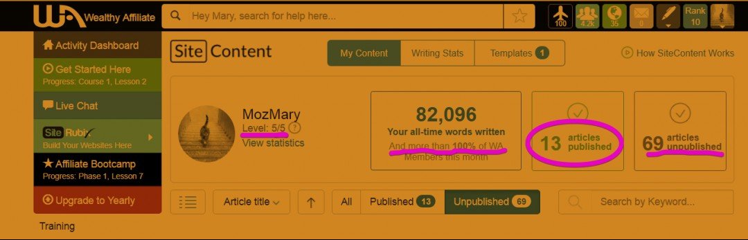 HOWEVER it currently records our research notes, and unpublished articles - so honestly I think my 'Research Status' deserves a 5/5 but at only 13 articles printed [including templates and test articles for other sites] and almost 70 unpublished articles currently gaining me 'status' [and that includes any article written for the WA dashboard and not our site] I think our Write Status in SiteContent should be tied to our Published word count to our websites, and not all our words pumped through the system.