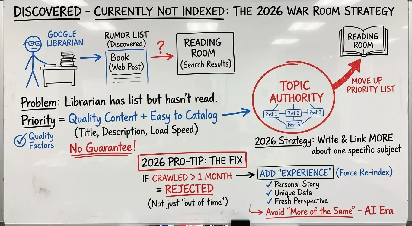 When a book is "Discovered - Currently Not Indexed," it means the librarian has heard rumors, or seen a list where the book (web post) exists, but hasn't read it yet.