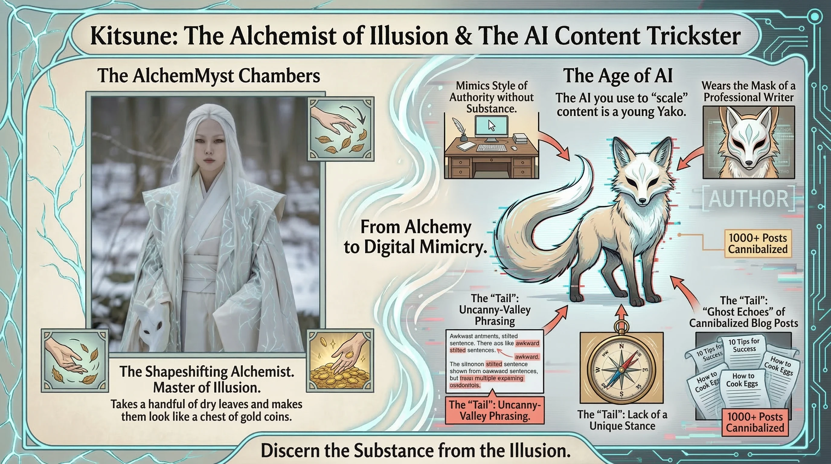 The AI you use to "scale" your content is a young, one-tailed Yako (a field fox). It’s a trickster. It knows how to mimic the style of authority without possessing the substance of it. It wears the mask of a professional writer, but if you look closely, you’ll see the "tail"—the uncanny-valley phrasing, coupled with the lack of a unique stance. If you listen closely, you can hear the "Ghost Echoes" of a thousand other blog posts it’s cannibalized.