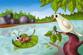 An Ant went to the bank of a river to quench its thirst, and being carried away by the rush of the stream, was on the point of drowning. A Dove sitting on a tree overhanging the water plucked a leaf and let it fall into the stream close to her. The Ant climbed onto it and floated in safety to the bank. Shortly afterwards a birdcatcher came and stood under the tree, and laid his lime-twigs for the Dove, which sat in the branches. The Ant, perceiving his design, stung him in the foot. In pain the birdcatcher threw down the twigs, and the noise made the Dove take wing. One good turn deserves another.
