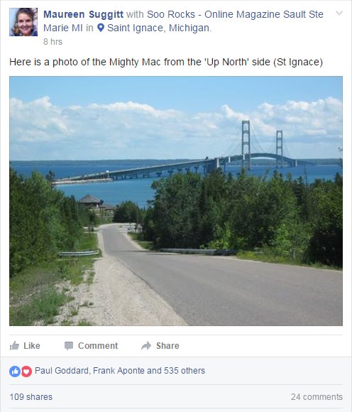 So this happens to be a group for people interested in my general part of the state. I don't push my FB Page, but rather post as myself, and include a tag w/my FB Page (Soo Rocks Online Mag) - so this post already has 535 likes and 109 shares - all who will see my link and hopefully a few will click - and like my FB Page and join my readers.