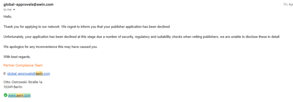 Gets weirder. Two days later I get an email titled: Congratulations - Your application to join Awin has now been approved