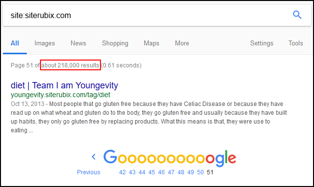 siterubix. com: about 218,000 ~500 [edit: my apologies - I didn't catch the error initially. Obviously 51 pages (at the time) can't hold 218k links. D'oh!]