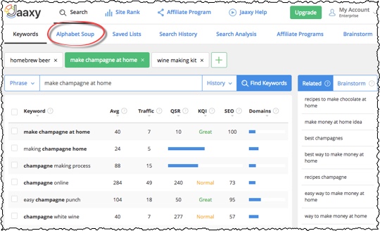 This process is much faster with Jaaxy's new Alphabet Soup tab.