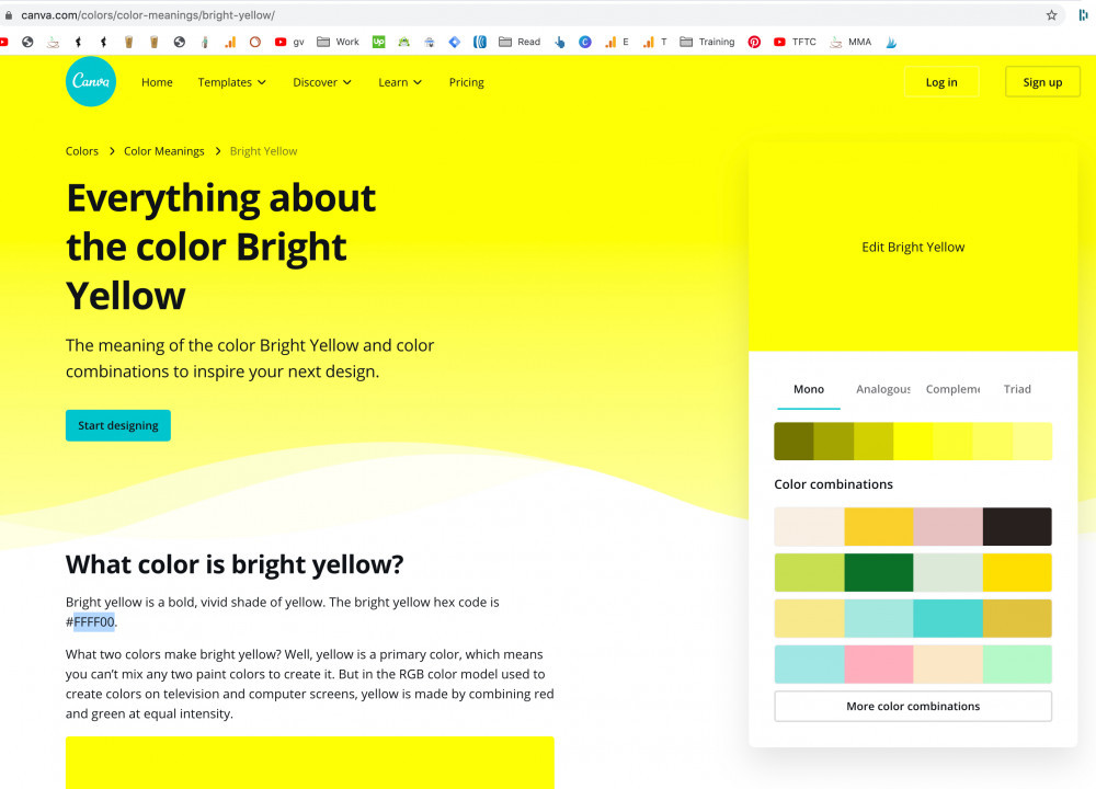 Canva, the image editing tool, not only gave me the exact color code I was looking for, they also included things like "The history of bright yellow", as well as things like the meaning, and what colors match.