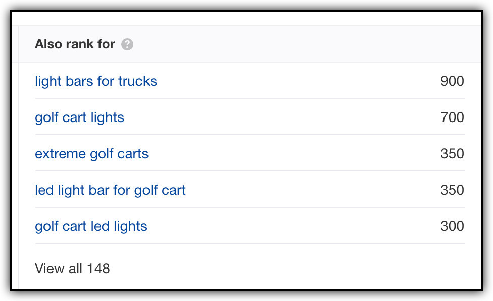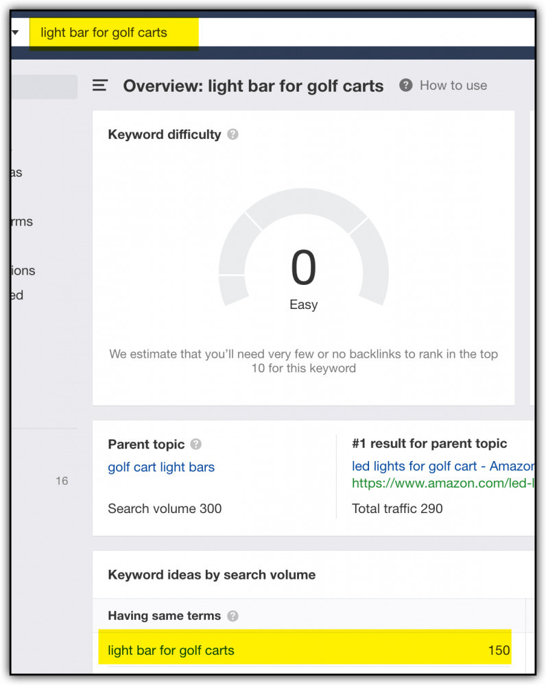 It has a decent amount of search volume, and aboslutely zero competition. This would be great for a Top 10 list IMO. I wouldn't make a website just for light bars for golf carts, but I would absolutely consider making an affiliate site for golf cart customization.