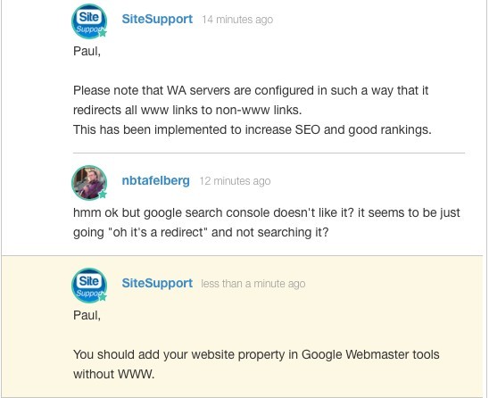 Maybe creating properties without the www is linked to that ...My recent site is set up without the www - also on advice from SiteSupport.